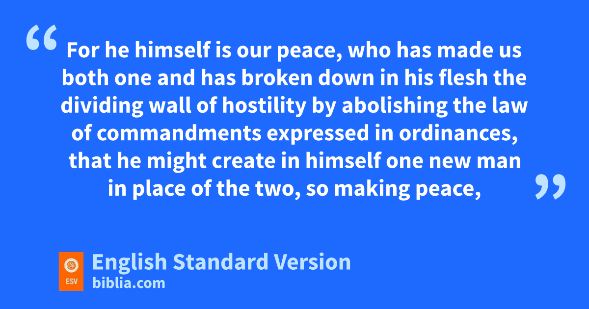 11 Therefore remember that at one time you Gentiles in the flesh, called “the uncircumcision” by what is called kthe circumcision, which is made in the flesh by hands— 12 remember lthat you were at that time separated from Christ, malienated from the commonwealth of Israel and strangers to nthe covenants of promise, ohaving no hope and without God in the world. 13 But now in Christ Jesus you who once were pfar off have been brought near qby the blood of Christ. 14 For rhe himself is our peace, swho has made us both one and has broken down tin his flesh the dividing wall of hostility 15 by abolishing the law of commandments expressed in uordinances, that he might create in himself one vnew man in place of the two, so making peace, 16 and might wreconcile us both to God in one body through the cross, thereby killing the hostility. 17 And he came and xpreached peace to you who were yfar off and peace to those who were znear. 18 For athrough him we both have baccess in cone Spirit to the Father. 19 So then you are no longer dstrangers and aliens,4 but you are efellow citizens with the saints and fmembers of the household of God, 20 gbuilt on the foundation of the hapostles and prophets, iChrist Jesus himself being jthe cornerstone, 21 kin whom the whole structure, being joined together, grows into la holy temple in the Lord. 22 In him myou also are being built together ninto a dwelling place for God by5 the Spirit.