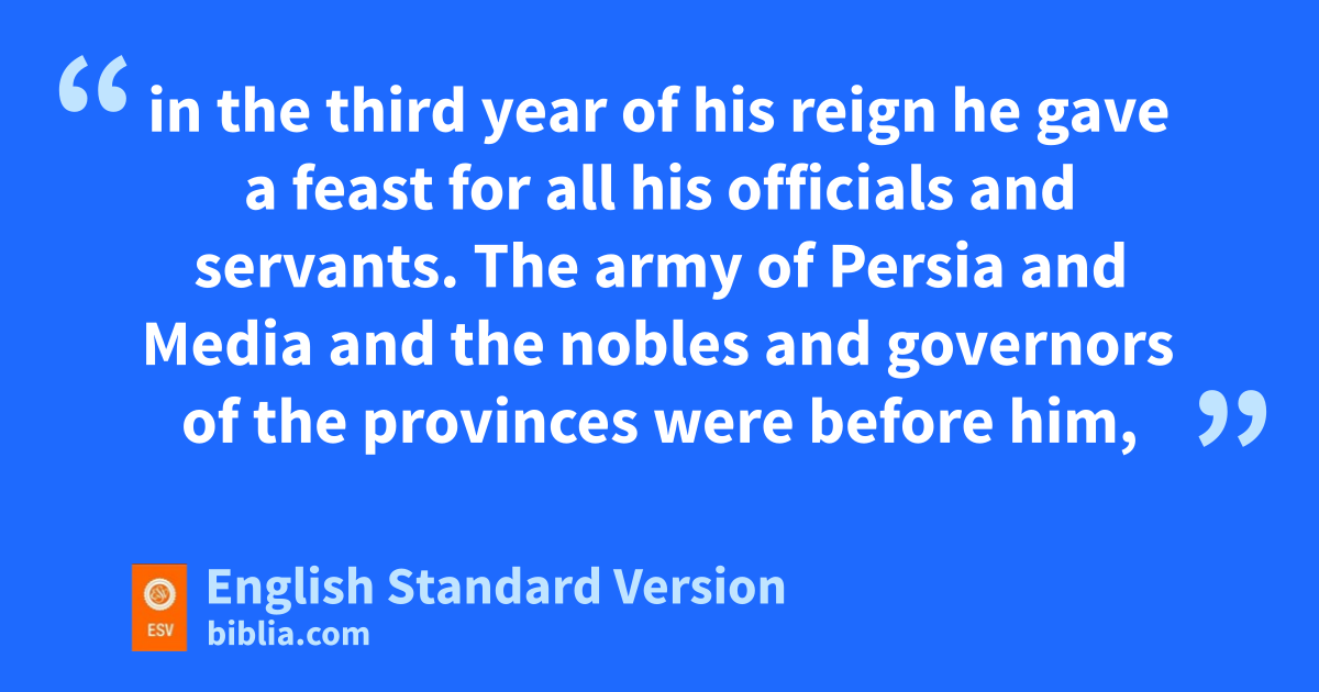 1 Now in the days of Ahasuerus, the Ahasuerus who reigned afrom India to Ethiopia over b127 provinces, 2 in those days when King Ahasuerus csat on his royal throne in dSusa, the citadel, 3 in the third year of his reign ehe gave a feast for all his officials and servants. The army of Persia and Media and the nobles and governors of the provinces were before him, 4 while he showed the riches of his royal glory and the splendor and pomp of his greatness for many days, 180 days. 5 And when these days were completed, the king gave for all the people present in Susa the citadel, both great and small, a feast lasting for seven days in the court of fthe garden of the king’s palace. 6 There were white cotton curtains and violet hangings fastened with cords of fine linen and purple to silver rods1 and marble pillars, and also gcouches of gold and silver on a mosaic pavement of porphyry, marble, mother-of-pearl, and precious stones. 7 Drinks were served in golden vessels, vessels of different kinds, and the royal wine was lavished according to the bounty of the king. 8 And drinking was according to this edict: “There is no compulsion.” For the king had given orders to all the staff of his palace to do as each man desired. 9 Queen Vashti also gave a feast for the women in the palace that belonged to King Ahasuerus.