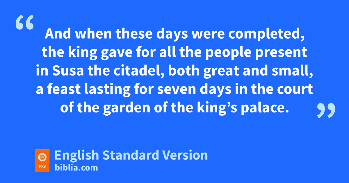 1 Now in the days of Ahasuerus, the Ahasuerus who reigned afrom India to Ethiopia over b127 provinces, 2 in those days when King Ahasuerus csat on his royal throne in dSusa, the citadel, 3 in the third year of his reign ehe gave a feast for all his officials and servants. The army of Persia and Media and the nobles and governors of the provinces were before him, 4 while he showed the riches of his royal glory and the splendor and pomp of his greatness for many days, 180 days. 5 And when these days were completed, the king gave for all the people present in Susa the citadel, both great and small, a feast lasting for seven days in the court of fthe garden of the king’s palace. 6 There were white cotton curtains and violet hangings fastened with cords of fine linen and purple to silver rods1 and marble pillars, and also gcouches of gold and silver on a mosaic pavement of porphyry, marble, mother-of-pearl, and precious stones. 7 Drinks were served in golden vessels, vessels of different kinds, and the royal wine was lavished according to the bounty of the king. 8 And drinking was according to this edict: “There is no compulsion.” For the king had given orders to all the staff of his palace to do as each man desired. 9 Queen Vashti also gave a feast for the women in the palace that belonged to King Ahasuerus.