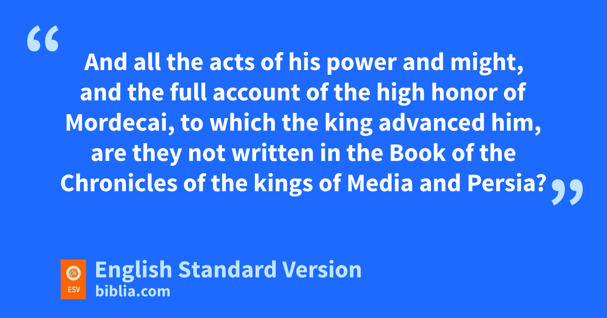 10 King Ahasuerus imposed tax on the land and on ythe coastlands of the sea. 2 And all the acts of his power and might, and the full account of the high honor of Mordecai, zto which the king advanced him, are they not written in athe Book of the Chronicles of the kings of Media and Persia? 3 For Mordecai the Jew was bsecond in rank to King Ahasuerus, and he was great among the Jews and popular with the multitude of his brothers, for he csought the welfare of his people and spoke peace to all his people.