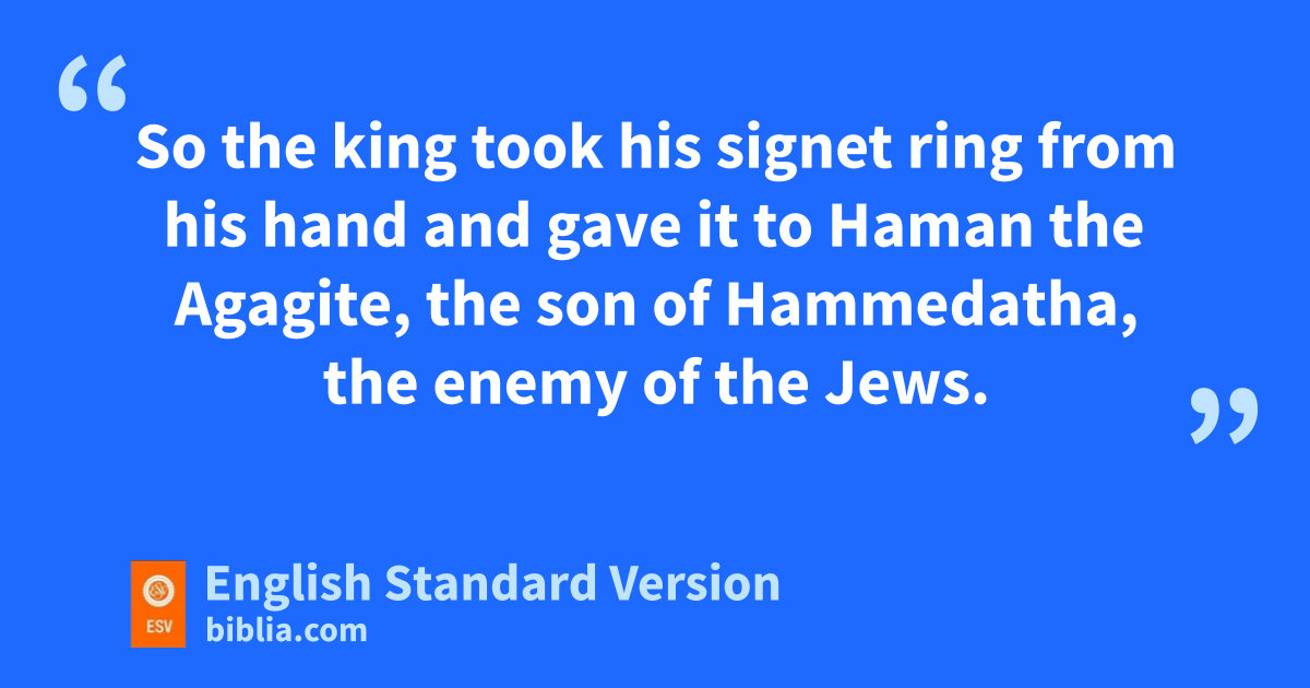7 In the first month, which is the month of Nisan, in the twelfth year of King Ahasuerus, xthey cast Pur (that is, they cast lots) before Haman day after day; and they cast it month after month till the twelfth month, which is ythe month of Adar. 8 Then Haman said to King Ahasuerus, “There is a certain people scattered abroad and dispersed among the peoples in all the provinces of your kingdom. zTheir laws are different from those of every other people, and they do not keep the king’s laws, so that it is not to the king’s profit to tolerate them. 9 If it please the king, let it be decreed that they be destroyed, and I will pay 10,000 talents3 of silver into the hands of those who have charge of the king’s business, that they may put it into the king’s treasuries.” 10 aSo the king took his signet ring from his hand and gave it to Haman bthe Agagite, the son of Hammedatha, cthe enemy of the Jews. 11 And the king said to Haman, “The money is given to you, the people also, to do with them as it seems good to you.”