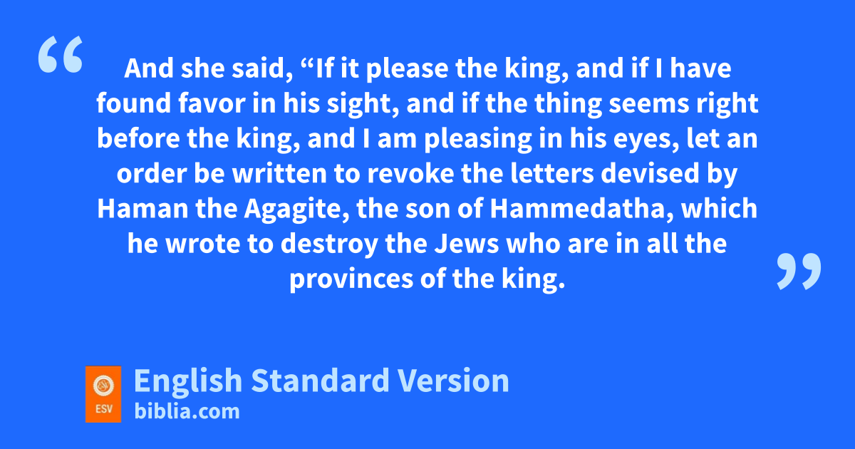 3 Then Esther spoke again to the king. She fell at his feet and wept and pleaded with him to avert the evil plan of Haman rthe Agagite and the plot that he had devised against the Jews. 4 sWhen the king held out the golden scepter to Esther, Esther rose and stood before the king. 5 And she said, “If it please the king, tand if I have found favor in his sight, and if the thing seems right before the king, and I am pleasing in his eyes, let an order be written to revoke uthe letters devised by Haman rthe Agagite, the son of Hammedatha, which he wrote to destroy the Jews who are in all the provinces of the king. 6 For how can I bear vto see the calamity that is coming to my people? Or how can I bear to see the destruction of my kindred?” 7 Then King Ahasuerus said to Queen Esther and to Mordecai the Jew, “Behold, wI have given Esther the house of Haman, and they have hanged him on the gallows,1 because he intended to lay hands on the Jews. 8 But you may write as you please with regard to the Jews, in the name of the king, xand seal it with the king’s ring, for an edict written in the name of the king and sealed with the king’s ring ycannot be revoked.”