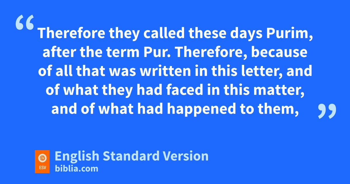 23 So the Jews accepted what they had started to do, and what Mordecai had written to them. 24 For Haman the Agagite, the son of Hammedatha, lthe enemy of all the Jews, mhad plotted against the Jews to destroy them, and nhad cast Pur (that is, cast lots), to crush and to destroy them. 25 But when it came before the king, he gave orders in writing othat his evil plan that he had devised against the Jews pshould return on his own head, and that he and his sons should be hanged on the gallows. 26 Therefore they called these days Purim, after the term nPur. Therefore, because of all that was written in qthis letter, and of what they had faced in this matter, and of what had happened to them, 27 the Jews firmly obligated themselves and their offspring and rall who joined them, that without fail they would keep sthese two days according to what was written and at the time appointed every year, 28 that these days should be remembered and kept throughout every generation, in every clan, province, and city, and that these days of Purim should never fall into disuse among the Jews, nor should the commemoration of these days cease among their descendants.