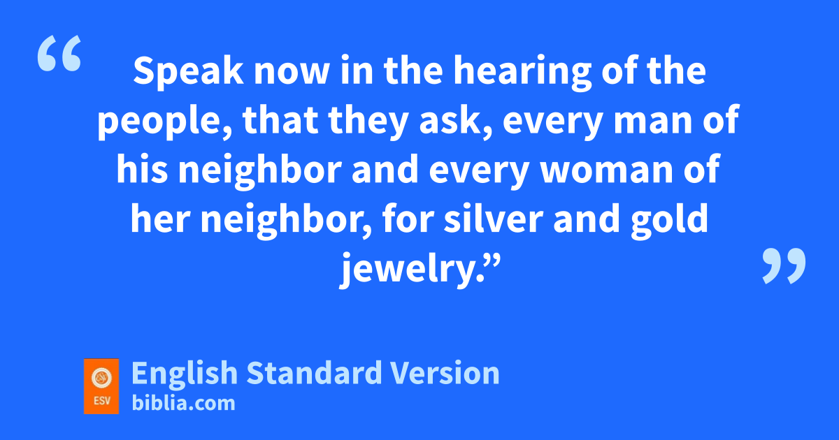 11 The Lord said to Moses, “Yet sone plague more I will bring upon Pharaoh and upon Egypt. Afterward he will let you go from here. tWhen he lets you go, he will drive you away completely. 2 Speak now in the hearing of the people, that uthey ask, every man of his neighbor and every woman of her neighbor, for silver and gold jewelry.” 3 vAnd the Lord gave the people favor in the sight of the Egyptians. Moreover, the man Moses was very great in the land of Egypt, in the sight of Pharaoh’s servants and in the sight of the people.