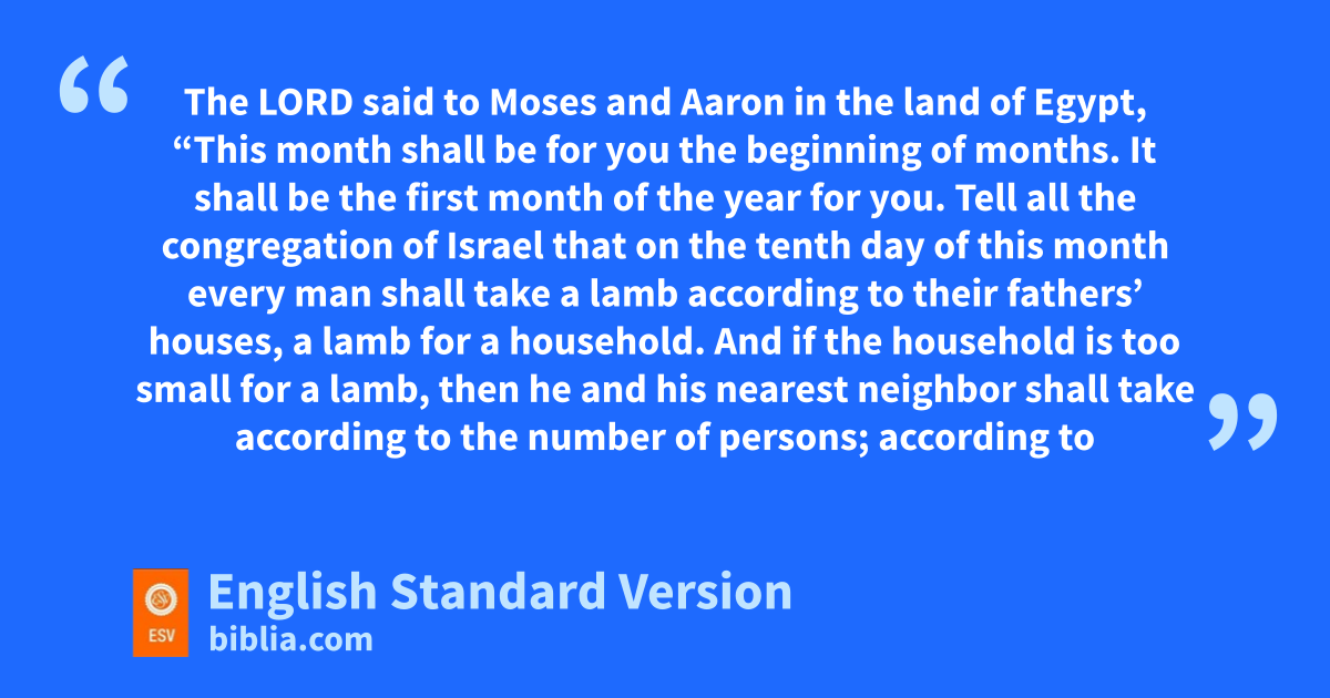 12 The Lord said to Moses and Aaron in the land of Egypt, 2 f“This month shall be for you the beginning of months. It shall be the first month of the year for you. 3 Tell all the congregation of Israel that on the tenth day of this month every man shall take a lamb gaccording to their fathers’ houses, a lamb for a household. 4 And if the household is too small for a lamb, then he and his nearest neighbor shall take according to the number of persons; according to what each can eat you shall make your count for the lamb. 5 Your lamb shall be hwithout blemish, a male a year old. You may take it from the sheep or from the goats, 6 and you shall keep it until the ifourteenth day of this month, when the whole assembly of the congregation of Israel shall kill their lambs at twilight.1