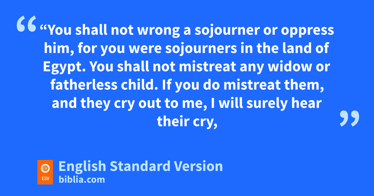 21 o“You shall not wrong a sojourner or oppress him, for you were sojourners in the land of Egypt. 22 pYou shall not mistreat any widow or fatherless child. 23 If you do mistreat them, and they qcry out to me, I will surely rhear their cry, 24 and my wrath will burn, and I will kill you with the sword, and syour wives shall become widows and your children fatherless.