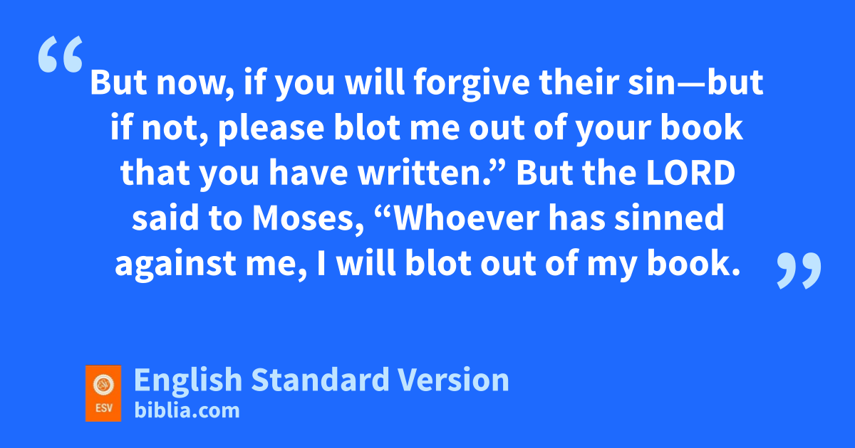 30 The next day Moses said to the people, f“You have sinned a great sin. And now I will go up to the Lord; gperhaps I can make atonement for your sin.” 31 So Moses returned to the Lord and said, “Alas, fthis people has sinned a great sin. They have hmade for themselves gods of gold. 32 But now, if iyou will forgive their sin—but if not, please jblot me out of kyour book that you have written.” 33 But the Lord said to Moses, l“Whoever has sinned against me, I will blot out of my book. 34 mBut now go, lead the people to the place about which I have spoken to you; nbehold, my angel shall go before you. Nevertheless, in the day when I visit, I will visit their sin upon them.”