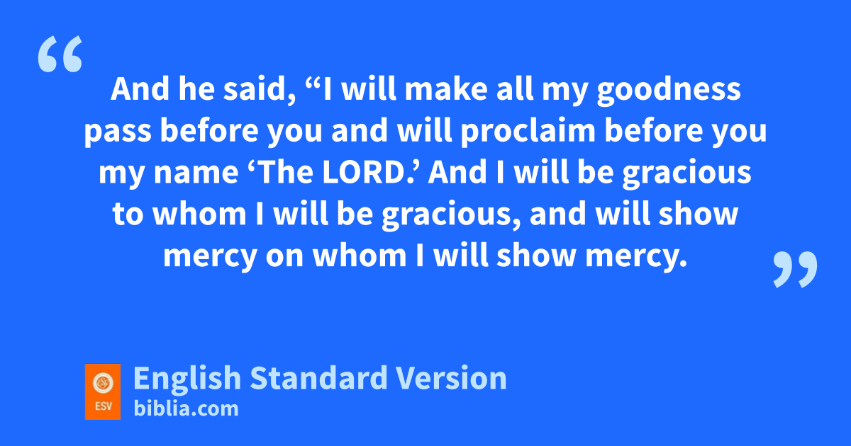 17 And the Lord said to Moses, “This very thing that you have spoken I will do, ofor you have found favor in my sight, and I know you by name.” 18 Moses said, “Please pshow me your glory.” 19 And he said, q“I will make all my goodness pass before you and will proclaim before you my name ‘The Lord.’ And rI will be gracious to whom I will be gracious, and will show mercy on whom I will show mercy. 20 But,” he said, “you cannot see my face, for sman shall not see me and live.” 21 And the Lord said, “Behold, there is a place by me where you shall stand on the rock, 22 and while my glory passes by I will put you in a tcleft of the rock, and I will ucover you with my hand until I have passed by. 23 Then I will take away my hand, and you shall see my back, but my face shall vnot be seen.”