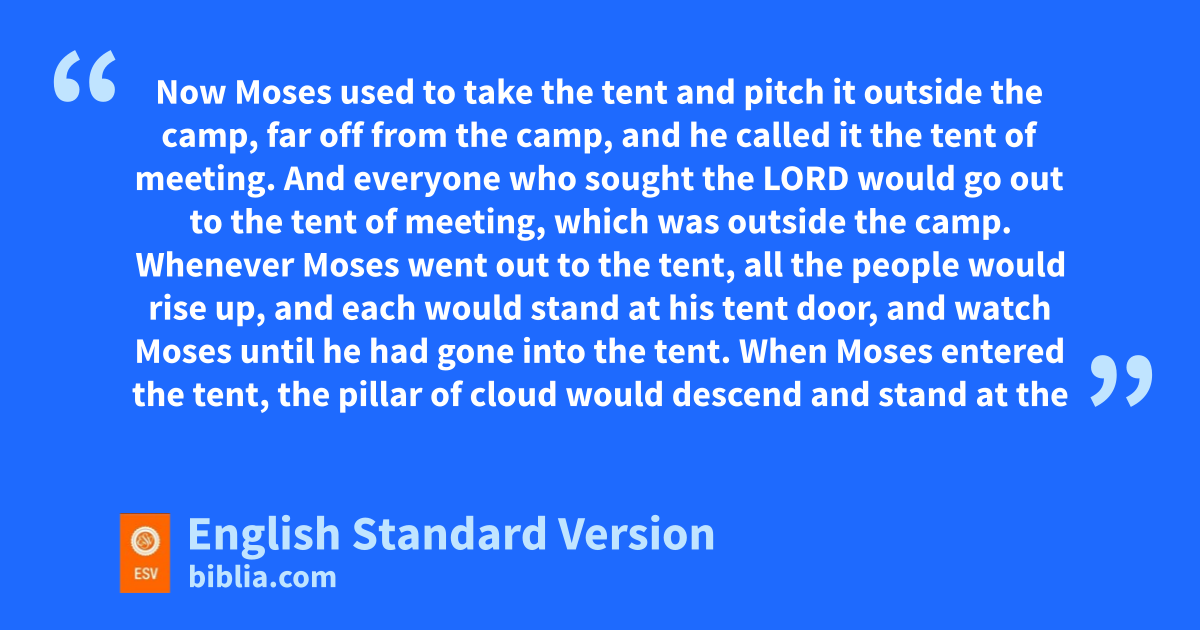 7 Now Moses used to take the tent and pitch it outside the camp, far off from the camp, and zhe called it the tent of meeting. And everyone who asought the Lord would go out to the tent of meeting, which was outside the camp. 8 Whenever Moses went out to the tent, all the people would rise up, and beach would stand at his tent door, and watch Moses until he had gone into the tent. 9 When Moses entered the tent, the cpillar of cloud would descend and stand at the entrance of the tent, and the Lord1 would speak with Moses. 10 And when all the people saw the pillar of cloud standing at the entrance of the tent, all the people would rise up and worship, each at his tent door. 11 Thus dthe Lord used to speak to Moses face to face, as a man speaks to his friend. When Moses turned again into the camp, his eassistant Joshua the son of Nun, a young man, would not depart from the tent.