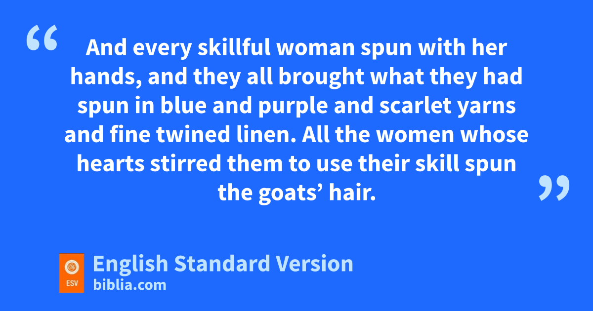 20 Then all the congregation of the people of Israel departed from the presence of Moses. 21 And they came, yeveryone whose heart stirred him, and everyone whose spirit moved him, zand brought the Lord’s contribution to be used for the tent of meeting, and for all its service, and for the holy garments. 22 So they came, both men and women. All who were of a willing heart brought brooches and earrings and signet rings and armlets, all sorts of gold objects, every man dedicating an offering of gold to the Lord. 23 And aevery one who possessed bblue or purple or scarlet yarns or fine linen or goats’ hair or tanned rams’ skins or goatskins brought them. 24 cEveryone who could make a contribution of silver or bronze brought it as the Lord’s contribution. And every one who possessed acacia wood of any use in the work brought it. 25 And every dskillful woman spun with her hands, and they all brought what they had spun in blue and purple and scarlet yarns and fine twined linen. 26 All the women ywhose hearts stirred them to use their skill spun the goats’ hair. 27 And the eleaders brought onyx stones and stones to be set, for the ephod and for the breastpiece, 28 and spices and oil for the light, and for the anointing oil, and for the fragrant incense. 29 fAll the men and women, the people of Israel, whose heart moved them to bring anything for the work that the Lord had commanded by Moses to be done brought it as a freewill offering to the Lord.