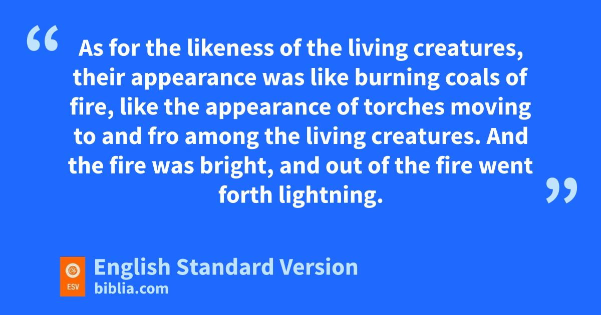4 As I looked, behold, ia stormy wind came jout of the north, and a great cloud, with kbrightness around it, and fire flashing forth continually, and in the midst of the fire, las it were gleaming metal.2 5 And from the midst of it came the likeness of mfour living creatures. nAnd this was their appearance: they had a human likeness, 6 obut each had four faces, and each of them had four wings. 7 Their legs were straight, and the soles of their feet were like the sole of a calf’s foot. And they sparkled plike burnished bronze. 8 Under their wings qon their four sides rthey had human hands. And the four had their faces and their wings thus: 9 their wings touched one another. sEach one of them went straight forward, qwithout turning as they went. 10 As for the likeness of their faces, teach had a human face. The four had the face of a lion on the right side, the four had the face of an ox on the left side, and the four had the face of an eagle. 11 Such were their faces. And their wings were spread out above. Each creature had two wings, each of which touched the wing of another, while utwo covered their bodies. 12 sAnd each went straight forward. vWherever the spirit3 would go, they went, without turning as they went. 13 As for the likeness of the living creatures, their appearance was wlike burning coals of fire, wlike the appearance of torches moving to and fro among the living creatures. xAnd the fire was bright, and out of the fire went forth lightning. 14 And the living creatures ydarted to and fro, zlike the appearance of a flash of lightning.