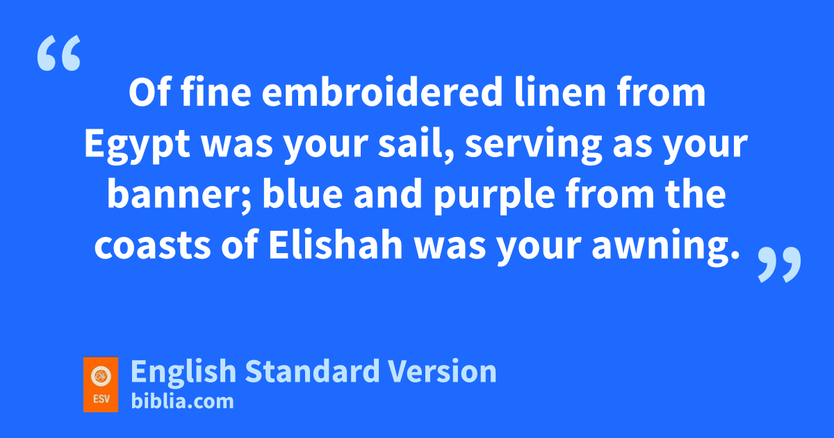 12 l“Tarshish did mbusiness with you because of your great wealth of every kind; silver, iron, tin, and lead they exchanged for your nwares. 13 oJavan, pTubal, and pMeshech traded with you; they exchanged human beings and vessels of bronze for your merchandise. 14 From qBeth-togarmah they exchanged horses, war horses, and mules rfor your wares. 15 The men of sDedan1 traded with you. Many coastlands were your own special markets; they brought you in payment ivory tusks and ebony. 16 Syria tdid business with you because of your abundant goods; they exchanged for your wares uemeralds, upurple, vembroidered work, wfine linen, coral, and xruby. 17 Judah and the land of Israel traded with you; they exchanged for your merchandise ywheat of zMinnith, meal,2 honey, oil, and abalm. 18 bDamascus did business with you for your abundant goods, because of your great wealth of every kind; wine of Helbon and cwool of Sahar 19 and casks of wine3 from Uzal they exchanged for your wares; wrought iron, dcassia, and ecalamus were bartered for your merchandise. 20 Dedan traded with you in saddlecloths for riding. 21 Arabia and all the princes of fKedar were your favored dealers fin lambs, rams, and goats; in these they did business with you. 22 The traders of gSheba and gRaamah traded with you; they exchanged hfor your wares ithe best of all kinds of spices and all precious stones and gold. 23 jHaran, Canneh, jEden, traders of Sheba, kAsshur, and Chilmad traded with you. 24 In your market these traded with you in choice garments, in clothes of lblue and lembroidered work, and in carpets of colored material, bound with cords and made secure. 25 mThe ships of nTarshish traveled for you with your merchandise. So you were filled and heavily laden oin the heart of the seas.