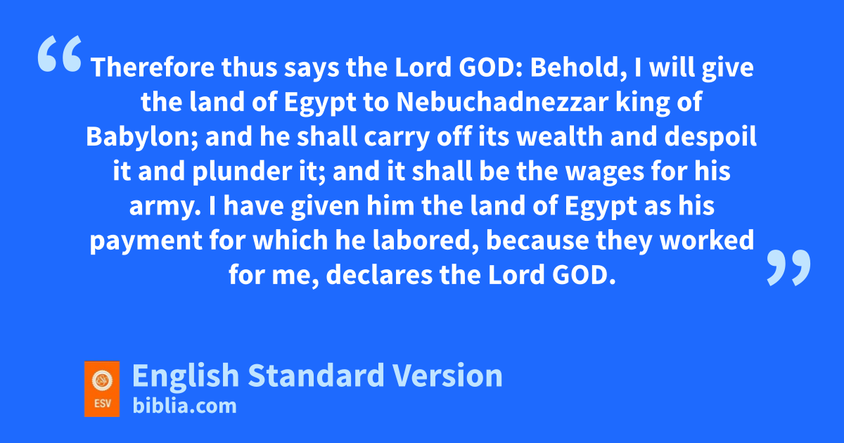 17 lIn the twenty-seventh year, in the first month, on the first day of the month, the word of the Lord came to me: 18 m“Son of man, nNebuchadnezzar king of Babylon made his army labor hard against Tyre. Every head was made bald, and every shoulder was rubbed bare, yet neither he nor his army got anything from Tyre to pay for the labor that he had performed against her. 19 Therefore thus says the Lord God: oBehold, I will give the land of Egypt to Nebuchadnezzar king of Babylon; pand he shall carry off its wealth4 qand despoil it and plunder it; and it shall be the wages for his army. 20 rI have given him the land of Egypt as his payment for which he labored, because they worked for me, declares the Lord God.