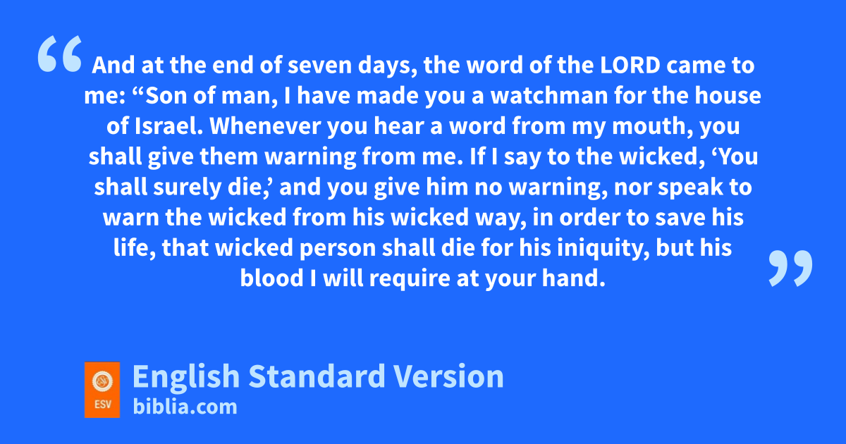 16 sAnd at the end of seven days, the word of the Lord came to me: 17 t“Son of man, uI have made you a watchman for the house of Israel. Whenever you hear a word from my mouth, you shall vgive them warning from me. 18 wIf I say to the wicked, x‘You shall surely die,’ vand you give him no warning, nor speak to warn the wicked from his wicked way, in order to save his life, that wicked person yshall die for4 his iniquity, zbut his blood I will require at your hand. 19 aBut if you warn the wicked, and he does not turn from his wickedness, or from his wicked way, he shall die for his iniquity, bbut you cwill have delivered your soul. 20 dAgain, if a righteous person turns from his righteousness and commits injustice, eand I lay a stumbling block before him, he shall die. vBecause you have not warned him, he shall die for his sin, dand his righteous deeds that he has done shall not be remembered, zbut his blood I will require at your hand. 21 But if you warn the righteous person not to sin, and he does not sin, he shall surely live, because he took warning, and you will have delivered your soul.”
