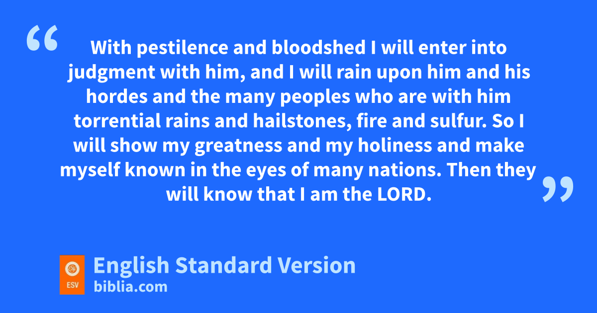 17 “Thus says the Lord God: Are you zhe of whom I spoke in former days by my servants the prophets of Israel, who in those days prophesied for years that I would bring you against them? 18 But on that day, the day that Gog shall come against the land of Israel, declares the Lord God, amy wrath will be roused in my anger. 19 For bin my jealousy and in my blazing wrath I declare, On that day cthere shall be a great earthquake in the land of Israel. 20 dThe fish of the sea and the birds of the heavens and the beasts of the field and all creeping things that creep on the ground, and all the people who are on the face of the earth, eshall quake at my presence. And fthe mountains shall be thrown down, and the cliffs shall fall, and every wall shall tumble to the ground. 21 gI will summon a sword against Gog4 on all my mountains, declares the Lord God. hEvery man’s sword will be against his brother. 22 With pestilence and bloodshed iI will enter into judgment with him, and jI will rain upon him and khis hordes and the many peoples who are with him ltorrential rains and hailstones, mfire and sulfur. 23 So I will show my greatness and my nholiness and omake myself known in the eyes of many nations. Then pthey will know that I am the Lord.