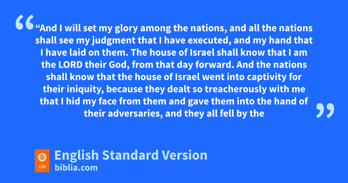 21 “And fI will set my glory among the nations, and all the nations shall see gmy judgment that I have executed, and gmy hand that I have laid on them. 22 hThe house of Israel shall know that I am the Lord their God, from that day forward. 23 And ithe nations shall know that the house of Israel went into captivity for their iniquity, because they dealt so treacherously with me that jI hid my face from them and kgave them into the hand of their adversaries, and they all fell by the sword. 24 I dealt with them laccording to their uncleanness and their transgressions, and hid my face from them.