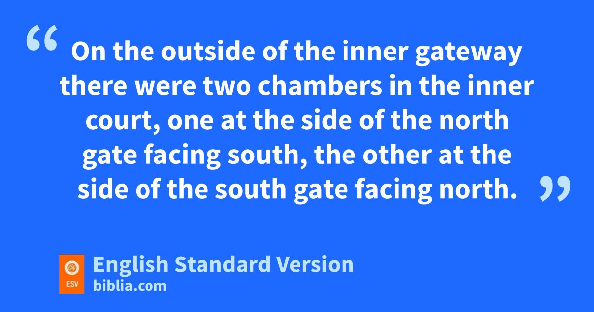 17 Then he brought me into uthe outer court. And behold, there were vchambers and a wpavement, all around the court. xThirty chambers faced the pavement. 18 And the pavement ran along the side of the gates, corresponding to the length of the gates. This was the lower pavement. 19 Then he measured the distance from the inner front of the lower gate to the outer front of the inner court,5 a hundred cubits on the east side and on the north side.6