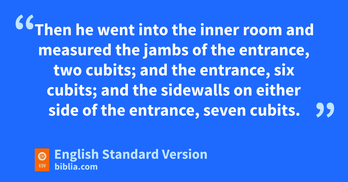 41 Then he brought me to mthe nave and measured the njambs. On each side six cubits1 was the breadth of the jambs.2 2 And the breadth of the entrance was ten cubits, and the sidewalls of the entrance were five cubits on either side. And he measured the length of the nave,3 oforty cubits, and its breadth, ptwenty cubits. 3 Then he went qinto the inner room and measured the jambs of the entrance, two cubits; and the entrance, six cubits; and the sidewalls on either side4 of the entrance, seven cubits. 4 And he measured rthe length of the room, twenty cubits, and its breadth, twenty cubits, across sthe nave. And he said to me, “This is tthe Most Holy Place.”