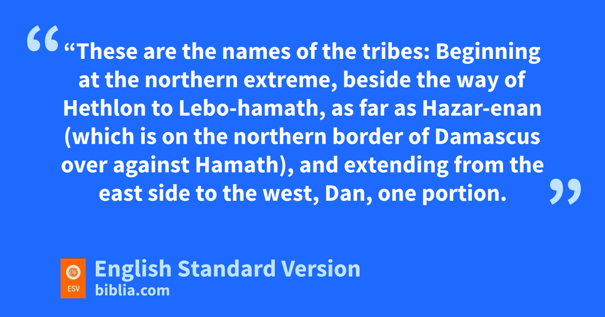 48 “These are the names of the tribes: Beginning at the northern extreme, beside kthe way of Hethlon lto Lebo-hamath, as far as mHazar-enan (which is on the northern border of nDamascus over against Hamath), and extending1 from the east side to the west,2 oDan, one portion. 2 Adjoining the territory of Dan, from the east side to the west, oAsher, one portion. 3 Adjoining the territory of Asher, from the east side to the west, oNaphtali, one portion. 4 Adjoining the territory of Naphtali, from the east side to the west, Manasseh, one portion. 5 Adjoining the territory of Manasseh, from the east side to the west, Ephraim, one portion. 6 Adjoining the territory of Ephraim, from the east side to the west, Reuben, one portion. 7 Adjoining the territory of Reuben, from the east side to the west, Judah, one portion.