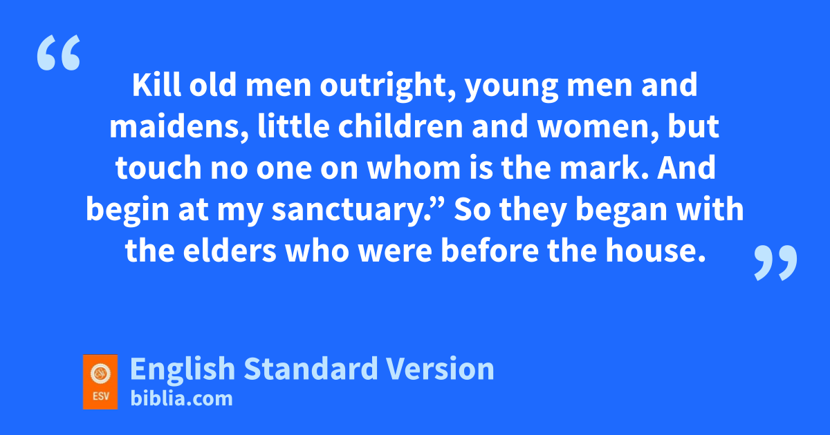 3 Now dthe glory of the God of Israel had gone up from the cherub on which it rested to ethe threshold of the house. And he called to bthe man clothed in linen, who had the writing case at his waist. 4 And the Lord said to him, “Pass through the city, through Jerusalem, and fput a mark on the foreheads of the men who gsigh and groan over all the abominations that are committed in it.” 5 And to hthe others he said in my hearing, “Pass through the city after him, and strike. iYour eye shall not spare, and you shall show no pity. 6 jKill old men outright, young men and maidens, little children and women, but ktouch no one on whom is the mark. And lbegin at my sanctuary.” So they began with the elders who were before the house. 7 Then he said to them, m“Defile the house, and fill the courts with the slain. Go out.” So they went out and struck in the city. 8 And while they were striking, and I was left alone, nI fell upon my face, and cried, o“Ah, Lord God! pWill you destroy all the remnant of Israel qin the outpouring of your wrath on Jerusalem?”