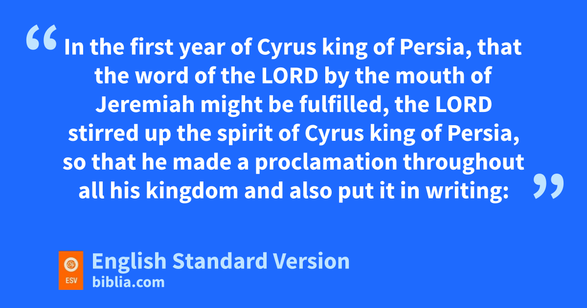 1 aIn the first year of Cyrus king of Persia, bthat the word of the Lord by the mouth of Jeremiah might be fulfilled, the Lord stirred up the spirit of Cyrus king of Persia, so cthat he made a proclamation throughout all his kingdom and also put it in writing: