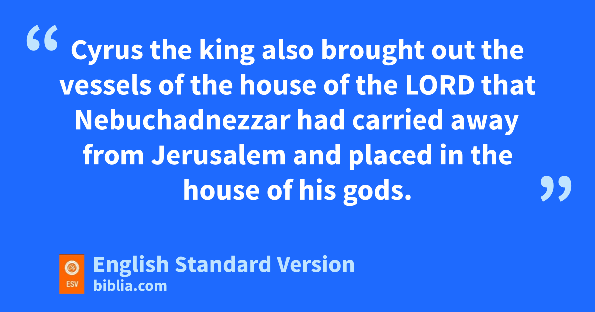5 Then rose up the heads of the fathers’ houses of Judah and Benjamin, and the priests and the Levites, feveryone whose spirit gGod had stirred to go up to rebuild the house of the Lord that is in Jerusalem. 6 And all who were about them haided them with vessels of silver, with gold, with goods, with beasts, and with costly wares, besides all that was freely offered. 7 iCyrus the king also brought out the vessels of the house of the Lord that jNebuchadnezzar had carried away from Jerusalem and placed in the house of his gods. 8 Cyrus king of Persia brought these out in the charge of kMithredath the treasurer, who counted them out to lSheshbazzar the prince of Judah. 9 And this was the number of them: m30 basins of gold, 1,000 basins of silver, 29 censers, 10 30 bowls of gold, 410 bowls of silver, and 1,000 other vessels; 11 all the vessels of gold and of silver were 5,400. All these did Sheshbazzar bring up, when the exiles were brought up from Babylonia to Jerusalem.