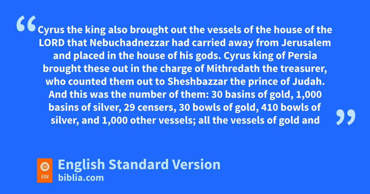 5 Then rose up the heads of the fathers’ houses of Judah and Benjamin, and the priests and the Levites, feveryone whose spirit gGod had stirred to go up to rebuild the house of the Lord that is in Jerusalem. 6 And all who were about them haided them with vessels of silver, with gold, with goods, with beasts, and with costly wares, besides all that was freely offered. 7 iCyrus the king also brought out the vessels of the house of the Lord that jNebuchadnezzar had carried away from Jerusalem and placed in the house of his gods. 8 Cyrus king of Persia brought these out in the charge of kMithredath the treasurer, who counted them out to lSheshbazzar the prince of Judah. 9 And this was the number of them: m30 basins of gold, 1,000 basins of silver, 29 censers, 10 30 bowls of gold, 410 bowls of silver, and 1,000 other vessels; 11 all the vessels of gold and of silver were 5,400. All these did Sheshbazzar bring up, when the exiles were brought up from Babylonia to Jerusalem.