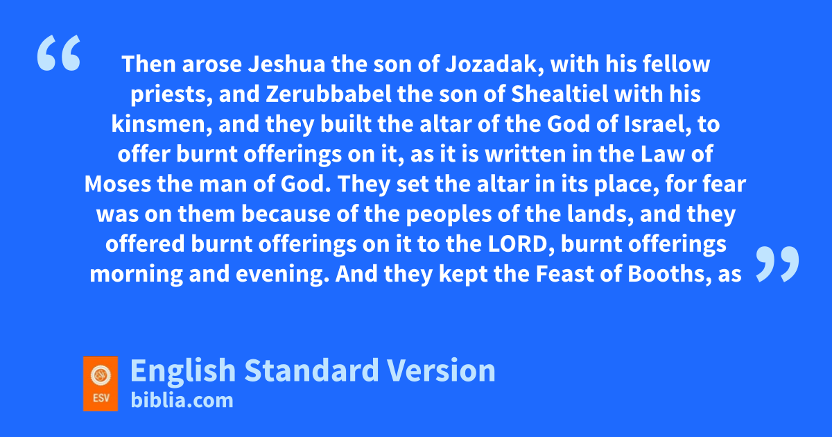 3 kWhen the seventh month came, and the children of Israel were in the towns, the people gathered as one man to Jerusalem. 2 Then arose Jeshua the son of Jozadak, with his fellow priests, and lZerubbabel the son of mShealtiel with his kinsmen, and they built the altar of the God of Israel, to offer burnt offerings on it, nas it is written in the Law of Moses the oman of God. 3 They set the altar in its place, pfor fear was on them because of the peoples of the lands, and qthey offered burnt offerings on it to the Lord, burnt offerings morning and evening. 4 rAnd they kept the Feast of Booths, sas it is written, tand offered the daily burnt offerings by number according to the rule, as each day required, 5 and after that the regular burnt uofferings, the offerings at the new moon vand at all the appointed feasts of the Lord, and the offerings of everyone who made a freewill offering to the Lord. 6 From the first day of the seventh month they began to offer burnt offerings to the Lord. But the foundation of the temple of the Lord was not yet laid. 7 So they gave money to the masons and the carpenters, wand food, drink, and oil to the Sidonians and the Tyrians xto bring cedar trees from Lebanon to the sea, to Joppa, yaccording to the grant that they had from Cyrus king of Persia.