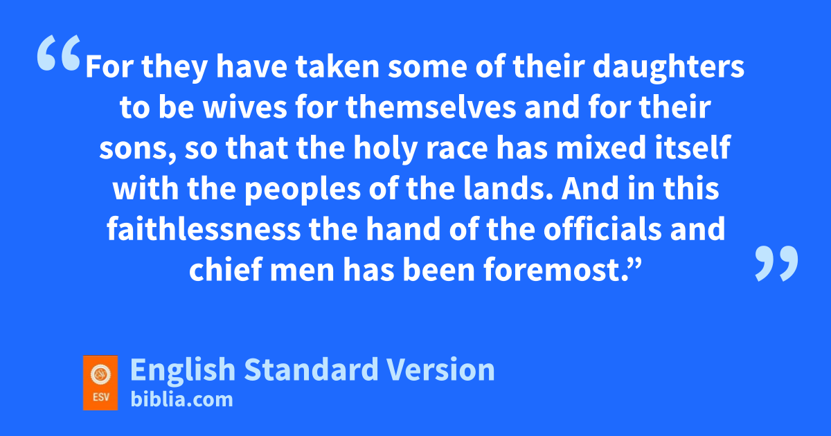 9 After these things had been done, the officials approached me and said, “The people of Israel and the priests and the eLevites have not separated themselves from the peoples of the lands fwith their abominations, from the gCanaanites, the Hittites, the Perizzites, the Jebusites, the Ammonites, the Moabites, the Egyptians, and the Amorites. 2 hFor they have taken some of their daughters to be wives for themselves and for their sons, so that the iholy race1 has jmixed itself with the peoples of the lands. And in this faithlessness the hand of the officials and chief men has been foremost.” 3 As soon as I heard this, I ktore my garment and my cloak and pulled hair from my head and beard and lsat appalled. 4 Then all who mtrembled at the words of the God of Israel, because of the faithlessness of the returned exiles, gathered around me while I sat nappalled until the evening sacrifice. 5 And at the nevening sacrifice I rose from my fasting, with my garment kand my cloak torn, and fell upon my knees oand spread out my hands to the Lord my God, 6 saying: