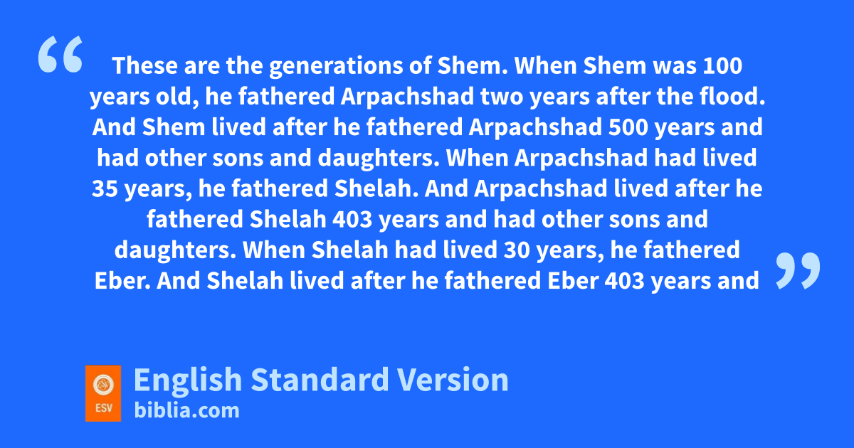 10 gThese are the generations of Shem. When Shem was 100 years old, he fathered Arpachshad two years after the flood. 11 And Shem lived after he fathered Arpachshad 500 years and had other sons and daughters.