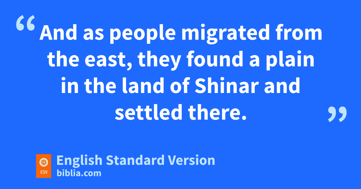 11 Now the whole earth had one language and the same words. 2 And as people migrated from the east, they found a plain in zthe land of Shinar and settled there. 3 And they said to one another, “Come, let us make bricks, and burn them thoroughly.” And they had brick for stone, aand bitumen for mortar. 4 Then they said, “Come, let us build ourselves a city and a tower bwith its top in the heavens, and let us make a name for ourselves, lest we be dispersed over the face of the whole earth.” 5 And cthe Lord came down to see the city and the tower, which the children of man had built. 6 And the Lord said, “Behold, they are one people, and they have all one language, and this is only the beginning of what they will do. And nothing that they propose to do will now be impossible for them. 7 Come, dlet us go down and there confuse their language, so that they may not understand one another’s speech.” 8 So ethe Lord dispersed them from there over the face of all the earth, and they left off building the city. 9 Therefore its name was called fBabel, because there the Lord confused1 the language of all the earth. And from there the Lord dispersed them over the face of all the earth.