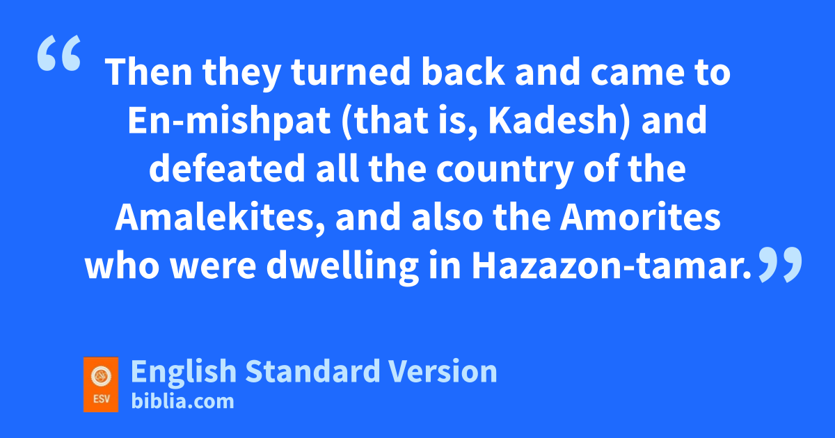 14 In the days of Amraphel king of vShinar, Arioch king of Ellasar, Chedorlaomer king of wElam, and Tidal king of Goiim, 2 these kings made war with xBera king of Sodom, Birsha king of Gomorrah, Shinab king of yAdmah, Shemeber king of yZeboiim, and the king of Bela (that is, Zoar). 3 And all these joined forces in the Valley of Siddim (zthat is, the Salt Sea). 4 Twelve years they had served Chedorlaomer, but in the thirteenth year they rebelled. 5 In the fourteenth year Chedorlaomer and the kings who were with him came and defeated the aRephaim in bAshteroth-karnaim, the cZuzim in Ham, the dEmim in Shaveh-kiriathaim, 6 and the eHorites in their hill country of Seir as far as fEl-paran on the border of the wilderness. 7 Then they turned back and came to En-mishpat (that is, gKadesh) and defeated all the country of the Amalekites, and also the Amorites who were dwelling hin Hazazon-tamar.