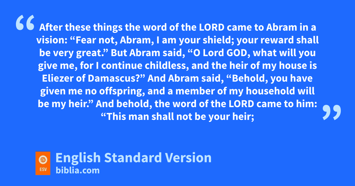 15 After these things the word of the Lord came to Abram in a vision: c“Fear not, Abram, I am dyour shield; your reward shall be very great.” 2 But Abram said, “O Lord God, what will you give me, for I continue1 childless, and the heir of my house is Eliezer of Damascus?” 3 And Abram said, “Behold, you have given me no offspring, and ea member of my household will be my heir.” 4 And behold, the word of the Lord came to him: “This man shall not be your heir; fyour very own son2 shall be your heir.” 5 And he brought him outside and said, “Look toward heaven, and gnumber the stars, if you are able to number them.” Then he said to him, h“So shall your offspring be.” 6 And ihe believed the Lord, and jhe counted it to him as righteousness.