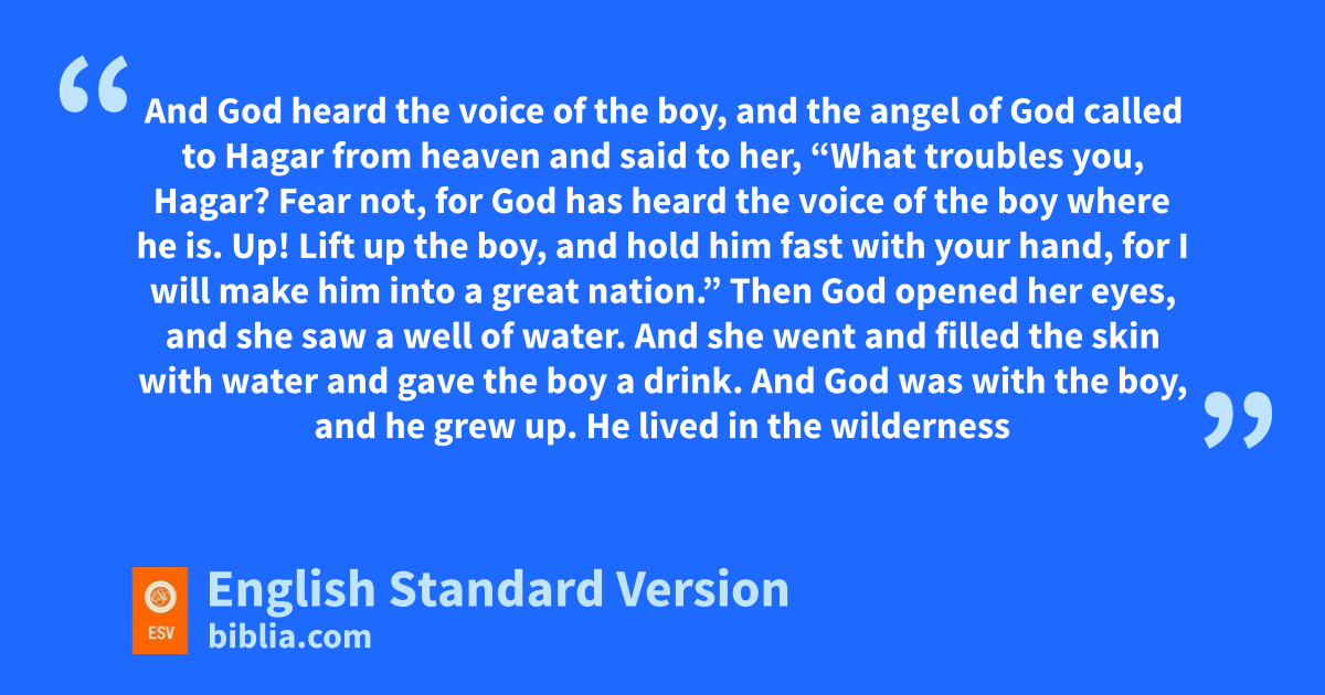 15 When the water in the skin was gone, she put the child under one of the bushes. 16 Then she went and sat down opposite him a good way off, about the distance of a bowshot, for she said, “Let me not look on the death of the child.” And as she sat opposite him, she lifted up her voice and wept. 17 And God heard the voice of the boy, and the angel of God called to Hagar from heaven and said to her, “What troubles you, Hagar? Fear not, for God has heard the voice of the boy where he is. 18 Up! Lift up the boy, and hold him fast with your hand, for I will make him into a great nation.” 19 Then aGod opened her eyes, and she saw a well of water. And she went and filled the skin with water and gave the boy a drink. 20 And God was with the boy, and he grew up. He lived in the wilderness band became an expert with the bow. 21 He lived in the wilderness of Paran, and his mother took a wife for him from the land of Egypt.