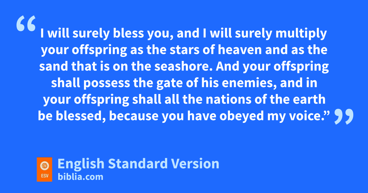 15 And the angel of the Lord called to Abraham a second time from heaven 16 and said, s“By myself I have sworn, declares the Lord, because you have done this and have not withheld your son, your only son, 17 I will surely bless you, and I will surely multiply your offspring tas the stars of heaven and uas the sand that is on the seashore. And your offspring shall possess vthe gate of his4 enemies, 18 and win your offspring shall all the nations of the earth be blessed, xbecause you have obeyed my voice.” 19 So Abraham returned to his young men, and they arose and went together to yBeersheba. And Abraham lived at yBeersheba.