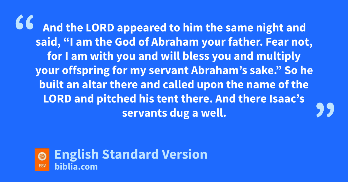 23 From there he went up to Beersheba. 24 And the Lord appeared to him the same night and said, o“I am the God of Abraham your father. pFear not, for qI am with you and will bless you and multiply your offspring for my servant Abraham’s sake.” 25 So he rbuilt an altar there and called upon the name of the Lord and pitched his tent there. And there Isaac’s servants dug a well.