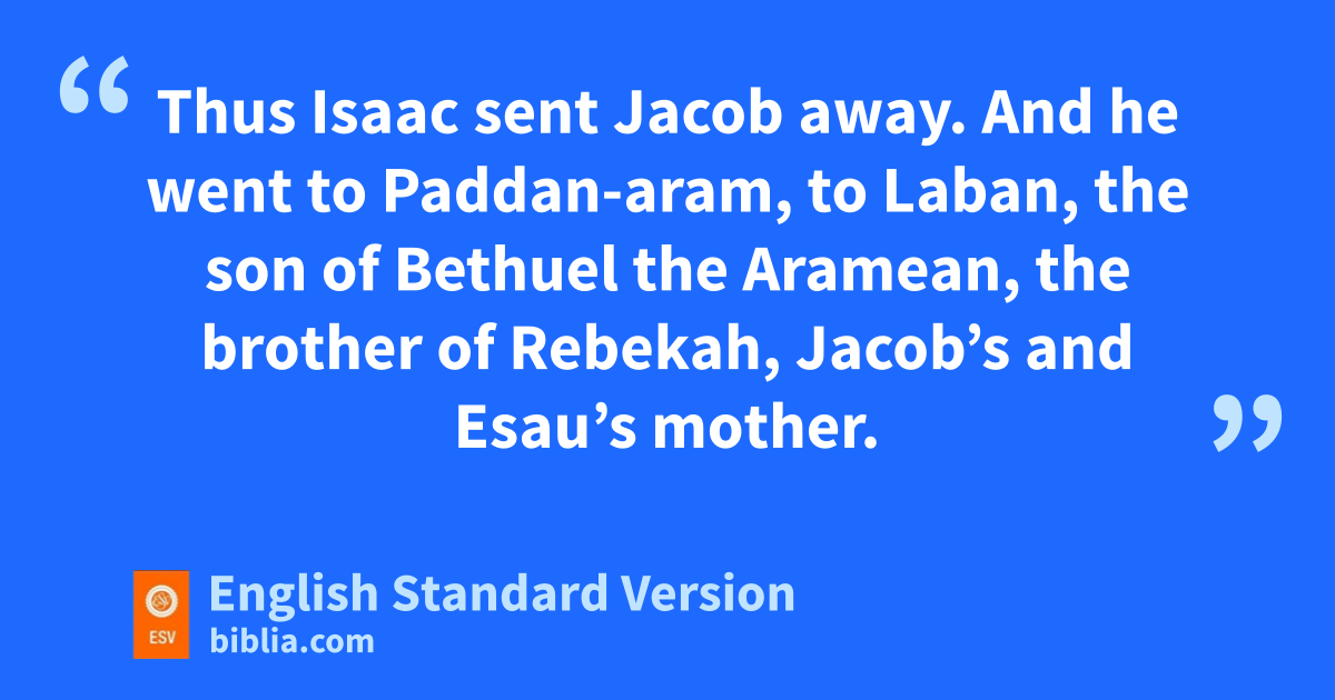 28 Then Isaac called Jacob gand blessed him and directed him, f“You must not take a wife from the Canaanite women. 2 hArise, go to Paddan-aram to the house of iBethuel your mother’s father, and take as your wife from there one of the daughters of Laban your mother’s brother. 3 jGod Almighty1 bless you and make you fruitful and multiply you, that you may become a company of peoples. 4 May he give kthe blessing of Abraham to you and to your offspring with you, that you may take possession of lthe land of your sojournings that God gave to Abraham!” 5 Thus Isaac sent Jacob away. And he went to Paddan-aram, to Laban, the son of Bethuel the Aramean, the brother of Rebekah, Jacob’s and Esau’s mother.