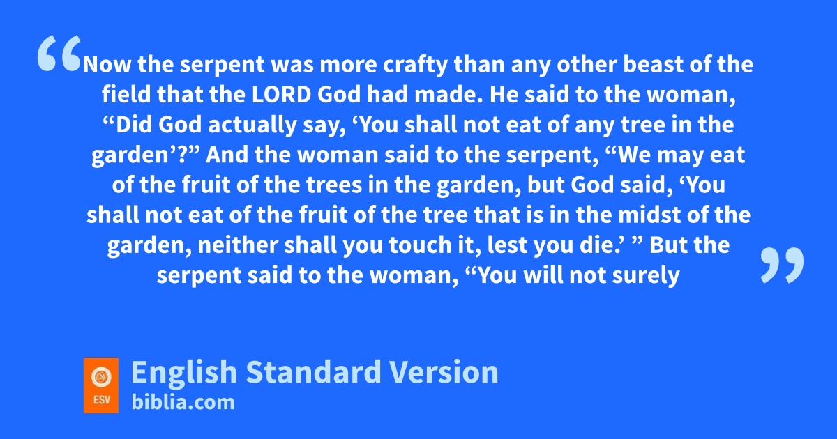 He said to the woman, “Did God actually say, ‘You1 shall not eat of any tree in the garden’?” 2 And the woman said to the serpent, “We may eat of the fruit of the trees in the garden, 3 but God said, v‘You shall not eat of the fruit of the tree that is in the midst of the garden, neither shall you touch it, lest you die.’ ” 4 wBut the serpent said to the woman, “You will not surely die. 5 For God knows that when you eat of it your eyes will be opened, and you will be like God, knowing good and evil.” 6 So when the woman saw that the tree was good for food, and that it was a delight to the eyes, and that the tree was to be desired to make one wise,2 she took of its fruit xand ate, and she also gave some to her husband who was with her, yand he ate. 7 zThen the eyes of both were opened, aand they knew that they were naked. And they sewed fig leaves together and made themselves loincloths.