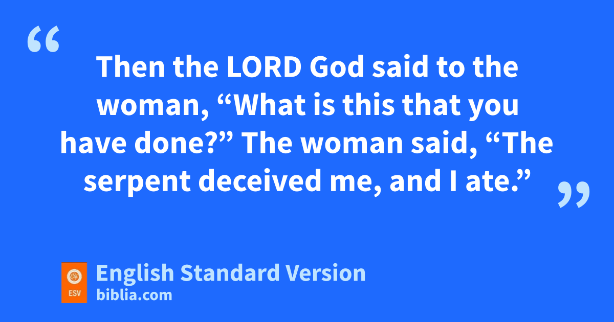 8 And they heard the sound of the Lord God walking in the garden in the cool3 of the day, and the man and his wife bhid themselves from the presence of the Lord God among the trees of the garden. 9 But the Lord God called to the man and said to him, “Where are you?”4 10 And he said, “I heard the sound of you in the garden, and I was afraid, cbecause I was naked, and I hid myself.” 11 He said, “Who told you that you were naked? Have you eaten of the tree of which I commanded you not to eat?” 12 The man said, d“The woman whom you gave to be with me, she gave me fruit of the tree, and I ate.” 13 Then the Lord God said to the woman, “What is this that you have done?” The woman said, e“The serpent deceived me, and I ate.”
