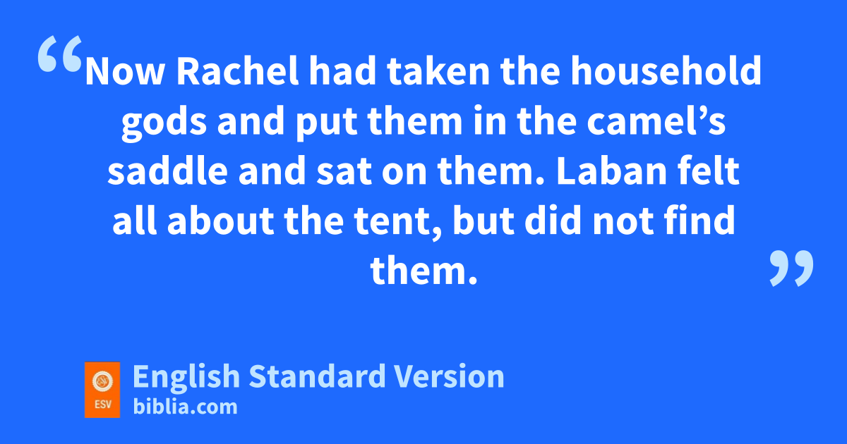 33 So Laban went into Jacob’s tent and into Leah’s tent and into the tent of the two female servants, but he did not find them. And he went out of Leah’s tent and entered Rachel’s. 34 Now Rachel had taken the household gods and put them in the camel’s saddle and sat on them. Laban felt all about the tent, but did not find them. 35 And she said to her father, “Let not my lord be angry that I cannot arise before you, for the way of women is upon me.” So he searched but did not find the household gods.