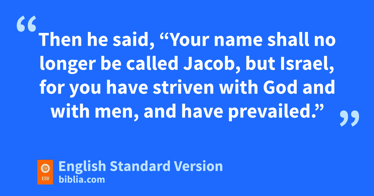 22 The same night he arose and took his two wives, his two female servants, and his eleven children,5 and crossed the ford of the fJabbok. 23 He took them and sent them across the stream, and everything else that he had. 24 And Jacob was left alone. And ga man wrestled with him until the breaking of the day. 25 When the man saw that he did not prevail against Jacob, he touched his hip socket, and Jacob’s hip was put out of joint as he wrestled with him. 26 Then he said, “Let me go, for the day has broken.” But Jacob said, h“I will not let you go unless you bless me.” 27 And he said to him, “What is your name?” And he said, “Jacob.” 28 Then he said, i“Your name shall no longer be called Jacob, but Israel,6 for jyou have striven with God and kwith men, and have prevailed.” 29 Then Jacob asked him, “Please tell me your name.” But he said, l“Why is it that you ask my name?” And there he blessed him. 30 So Jacob called the name of the place Peniel,7 saying, “For mI have seen God face to face, and yet my life has been delivered.” 31 The sun rose upon him as he passed nPenuel, limping because of his hip. 32 Therefore to this day the people of Israel do not eat the sinew of the thigh that is on the hip socket, because he touched the socket of Jacob’s hip on the sinew of the thigh.