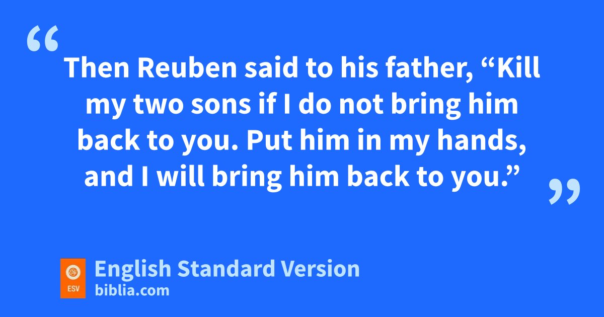 35 kAs they emptied their sacks, behold, every man’s bundle of money was in his sack. And when they and their father saw their bundles of money, they were afraid. 36 And Jacob their father said to them, “You have lbereaved me of my children: Joseph is no more, and Simeon is no more, and now you would take Benjamin. All this has come against me.” 37 Then Reuben said to his father, “Kill mmy two sons if I do not bring him back to you. Put him in my hands, and I will bring him back to you.” 38 But he said, “My son shall not go down with you, for nhis brother is dead, and he is the only one left. oIf harm should happen to him on the journey that you are to make, pyou would bring down my gray hairs with sorrow to Sheol.”