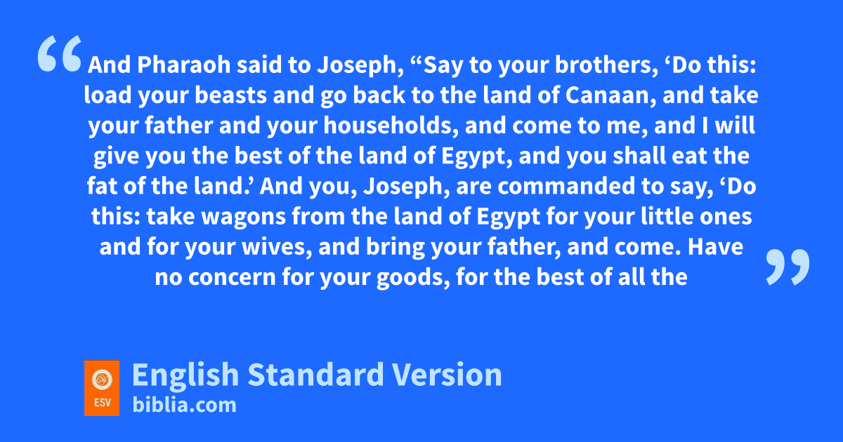 16 When the report was heard in Pharaoh’s house, “Joseph’s brothers have come,” it pleased Pharaoh and his servants. 17 And Pharaoh said to Joseph, “Say to your brothers, ‘Do this: load your beasts and go back to the land of Canaan, 18 and take your father and your households, and come to me, and aI will give you the best of the land of Egypt, and you shall eat the fat of the land.’ 19 And you, Joseph, are commanded to say, ‘Do this: take bwagons from the land of Egypt for your little ones and for your wives, and bring your father, and come. 20 Have no concern for1 your goods, for the best of all the land of Egypt is yours.’ ”
