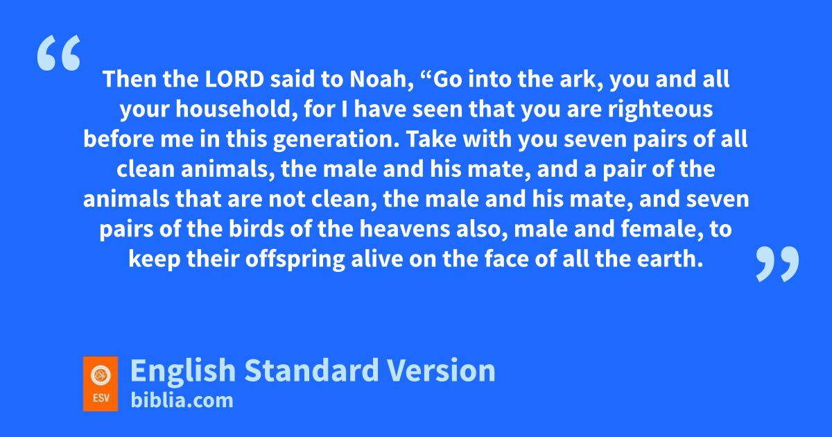 7 Then the Lord said to Noah, p“Go into the ark, you and all your household, for I have seen that qyou are righteous before me in this generation. 2 Take with you seven pairs of all rclean animals,1 the male and his mate, and a pair of the animals that are not clean, the male and his mate, 3 and seven pairs2 of the birds of the heavens also, male and female, to keep their offspring alive on the face of all the earth. 4 For in seven days sI will send rain on the earth forty days and forty nights, tand every living thing3 that I have made I will blot out from the face of the ground.” 5 uAnd Noah did all that the Lord had commanded him.