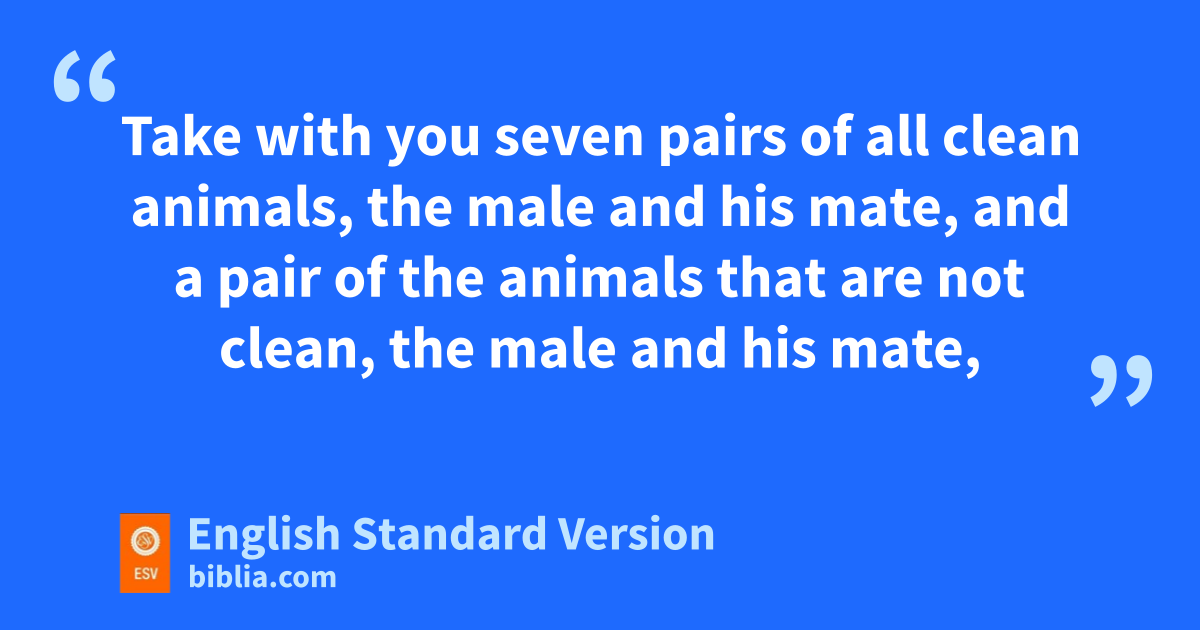 7 Then the Lord said to Noah, p“Go into the ark, you and all your household, for I have seen that qyou are righteous before me in this generation. 2 Take with you seven pairs of all rclean animals,1 the male and his mate, and a pair of the animals that are not clean, the male and his mate, 3 and seven pairs2 of the birds of the heavens also, male and female, to keep their offspring alive on the face of all the earth. 4 For in seven days sI will send rain on the earth forty days and forty nights, tand every living thing3 that I have made I will blot out from the face of the ground.” 5 uAnd Noah did all that the Lord had commanded him.