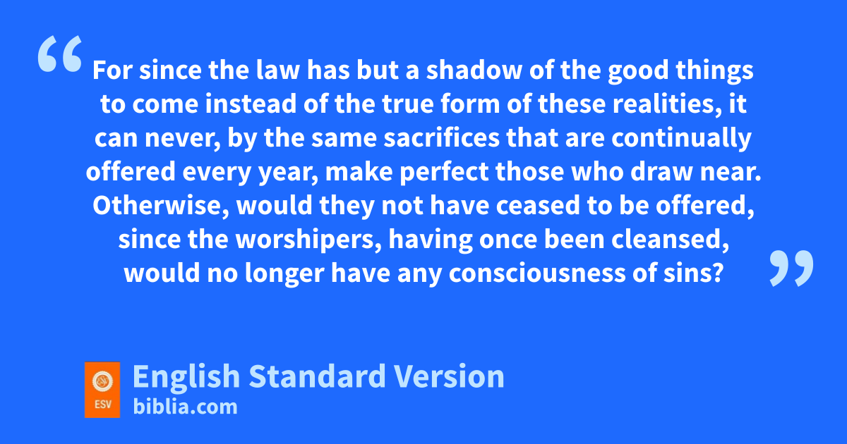 10 For since the law has but va shadow wof the good things to come instead of the true form of these realities, xit can never, by the same sacrifices that are continually offered every year, make perfect those who draw near. 2 Otherwise, would they not have ceased to be offered, since the worshipers, having once been cleansed, would no longer have any consciousness of sins? 3 But yin these sacrifices zthere is a reminder of sins every year. 4 For ait is impossible for the blood of bulls and goats to take away sins.