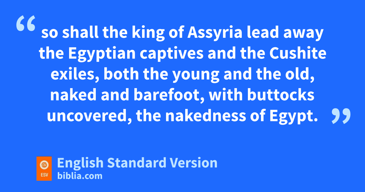 3 Then the Lord said, “As my servant Isaiah has walked naked and barefoot for three years oas a sign and a portent against Egypt and Cush,1 4 so shall the pking of Assyria lead away the Egyptian captives and the Cushite exiles, both the young and the old, naked and barefoot, with buttocks uncovered, the nakedness of Egypt. 5 qThen they shall be dismayed and ashamed because of Cush their hope and of Egypt their boast. 6 And the inhabitants of rthis coastland will say in that day, ‘Behold, this is what has happened to those in whom we hoped and sto whom we fled for help to be delivered from the king of Assyria! And we, how shall we escape?’ ”