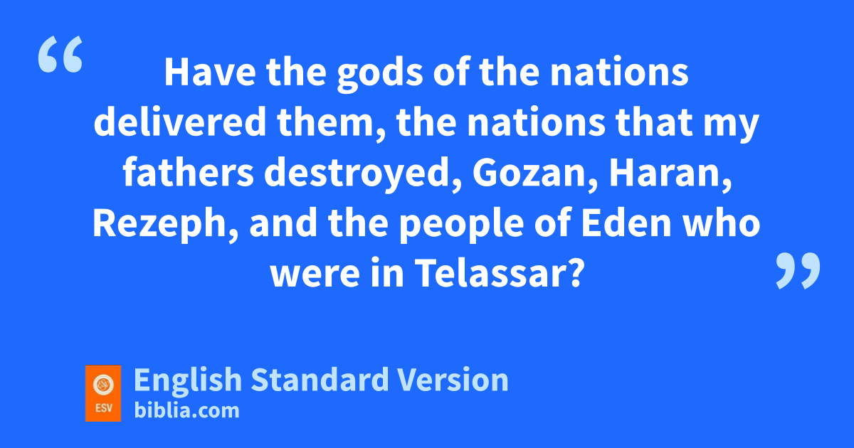 8 The Rabshakeh returned, and found the king of Assyria fighting against mLibnah, for he had heard that the king had left mLachish. 9 Now the king heard concerning Tirhakah king of nCush,1 “He has set out to fight against you.” And when he heard it, he sent messengers to Hezekiah, saying, 10 “Thus shall you speak to Hezekiah king of Judah: o‘Do not let your God in whom you trust deceive you by promising that Jerusalem will not be given into the hand of the king of Assyria. 11 Behold, you have heard what the kings of Assyria have done to all lands, devoting them to destruction. And shall you be delivered? 12 pHave the gods of the nations delivered them, the nations that my fathers destroyed, qGozan, rHaran, Rezeph, and the people of Eden who were in Telassar? 13 pWhere is the king of Hamath, the king of Arpad, the king of the city of Sepharvaim, the king of Hena, or the king of Ivvah?’ ”
