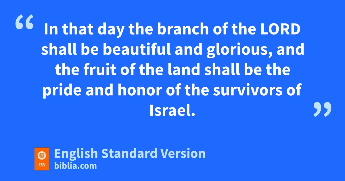 2 In that day ithe branch of the Lord shall be beautiful and glorious, and jthe fruit of the land shall be the pride and honor of the survivors of Israel. 3 kAnd he who is left in Zion and remains in Jerusalem will be called lholy, everyone who has mbeen recorded for life in Jerusalem, 4 when nthe Lord shall have washed away the filth of othe daughters of Zion and cleansed the bloodstains of Jerusalem from its midst by a spirit of judgment and by pa spirit of burning.1 5 Then the Lord will create over the whole site of Mount Zion and over her assemblies qa cloud by day, and smoke and the shining of a flaming fire by night; for over all the glory there will be ra canopy. 6 sThere will be a tbooth for shade by day from the heat, and ufor a refuge and a shelter from the storm and rain.