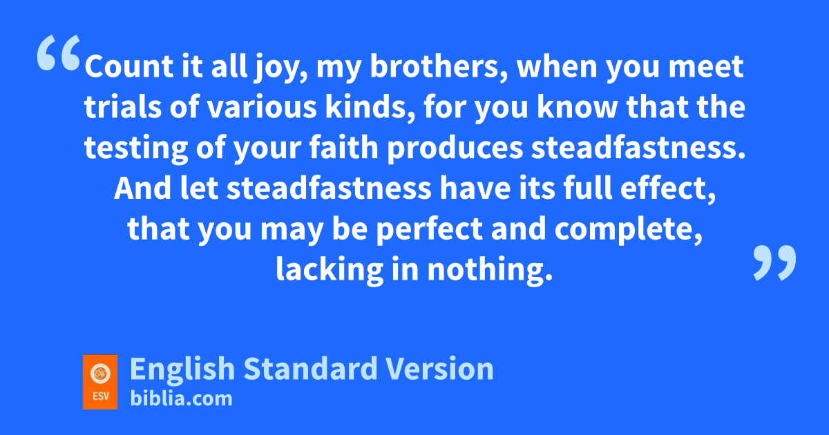 2 eCount it all joy, my brothers,2 when you meet trials fof various kinds, 3 for you know that gthe testing of your faith hproduces steadfastness. 4 And let steadfastness have its full effect, that you may be iperfect and complete, lacking in nothing.